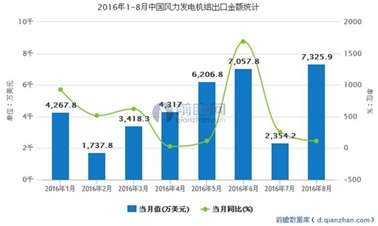 數據顯示,2016年1-8月中國風力發電機組出口金額為36685.6萬美元,同比增長208.2%。其中,8月出口金額現今年最高峰,達到7325.9萬美元。2016年1-8月中國風力發電機組出口金額統計表如下表所示: