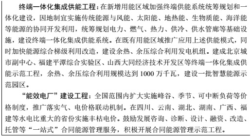 工程, 實(shí)施城市配電網(wǎng)建設(shè)改造行動(dòng), 強(qiáng)化統(tǒng)一規(guī)劃, 健全技術(shù)標(biāo)準(zhǔn), 適度超前建設(shè), 促進(jìn)城鄉(xiāng)網(wǎng)源協(xié)調(diào)發(fā)展。 統(tǒng)籌電網(wǎng)升級(jí)改造與電能替代, 滿足居民采暖領(lǐng)域電能替代。 積極推進(jìn)棚戶區(qū)改造配套熱電聯(lián)產(chǎn)機(jī)組建設(shè)。 加快天然氣支線管網(wǎng)建設(shè), 擴(kuò)大管網(wǎng)覆蓋范圍。 在天然氣管網(wǎng)未覆蓋地區(qū)推進(jìn)液化天然氣、 壓縮天然氣、 液化石油氣直供, 保障民生用氣。推動(dòng)水電氣熱計(jì)量器具智能化升級(jí)改造, 加強(qiáng)能源資源精細(xì)化管理。 積極推進(jìn)城市地下綜合管廊建設(shè), 鼓勵(lì)能源管網(wǎng)與通信、 供水等管線統(tǒng)一規(guī)劃、 設(shè)計(jì)和施工, 促進(jìn)城市空間集約化利用。