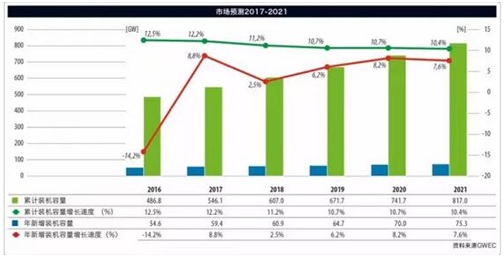 風電在電力需求中所占的比例(滲透率)繼續提高,丹麥達到了40%, 緊隨其后的是烏拉圭,葡萄牙和愛爾蘭,它們都超過了20%, 西班牙和塞浦路斯都達到20%, 德國16%。 一些大的電力市場如中國、美國和加拿大的風電滲透率分別達到4%、5.5%和6%。全球風能理事會的五年市場預測顯示2017年全球風電年新增裝機有望達到60GW, 到2021年新增裝機容量將增至75GW, 使累計容量到2021年超過800GW。