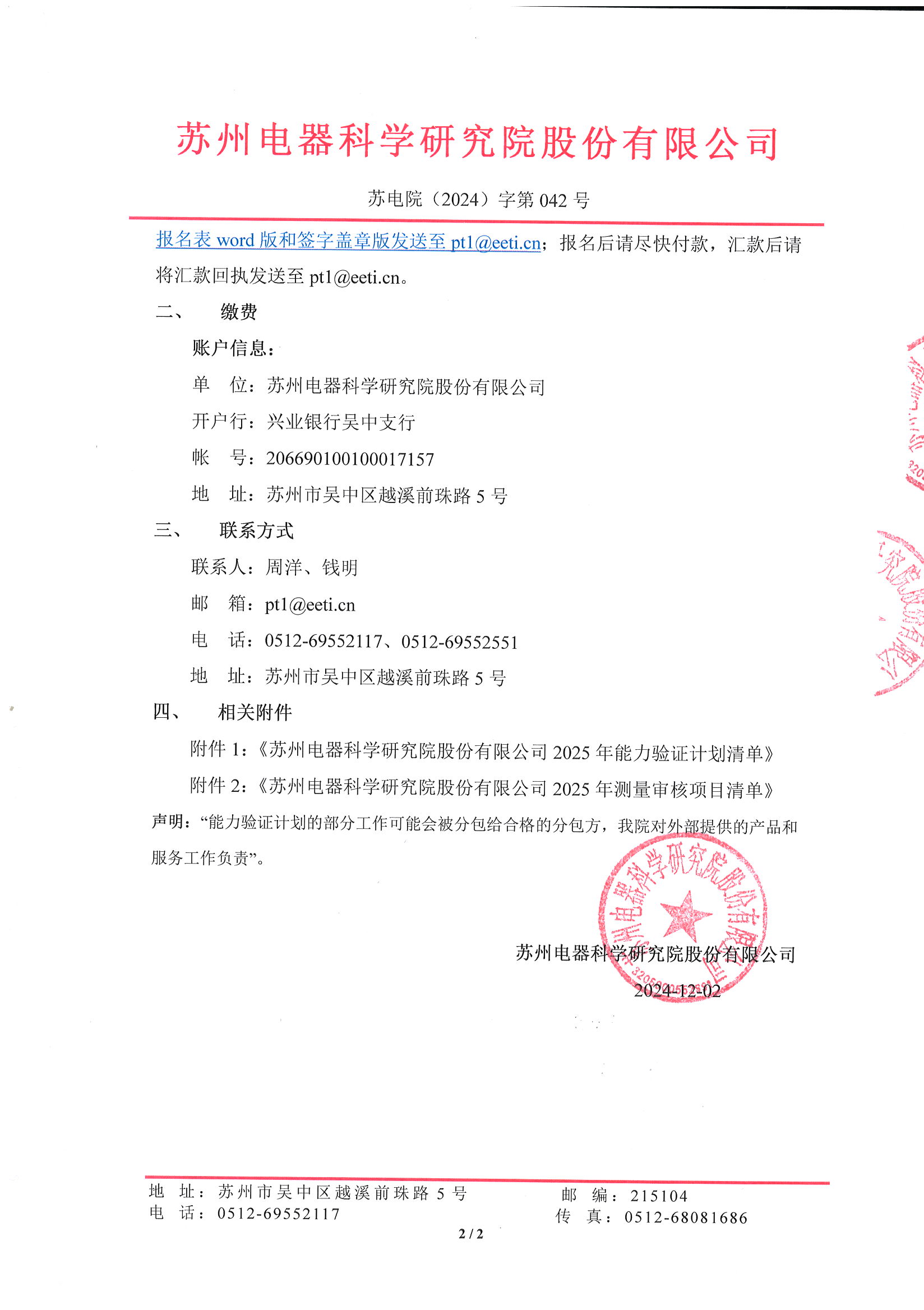 附件 蘇州電器科學(xué)研究院股份有限公司2024年能力驗證計劃報名表