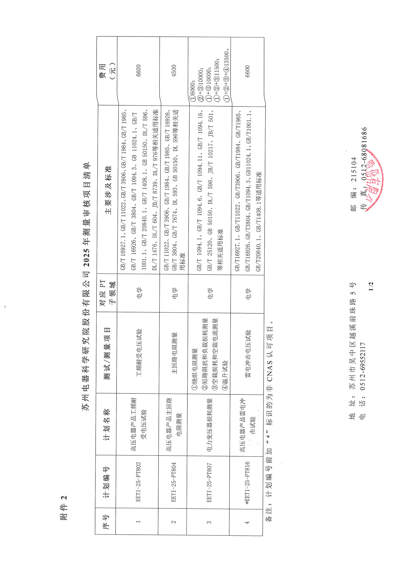 附件2:《蘇州電器科學(xué)研究院股份有限公司2025年測量審核項目清單》